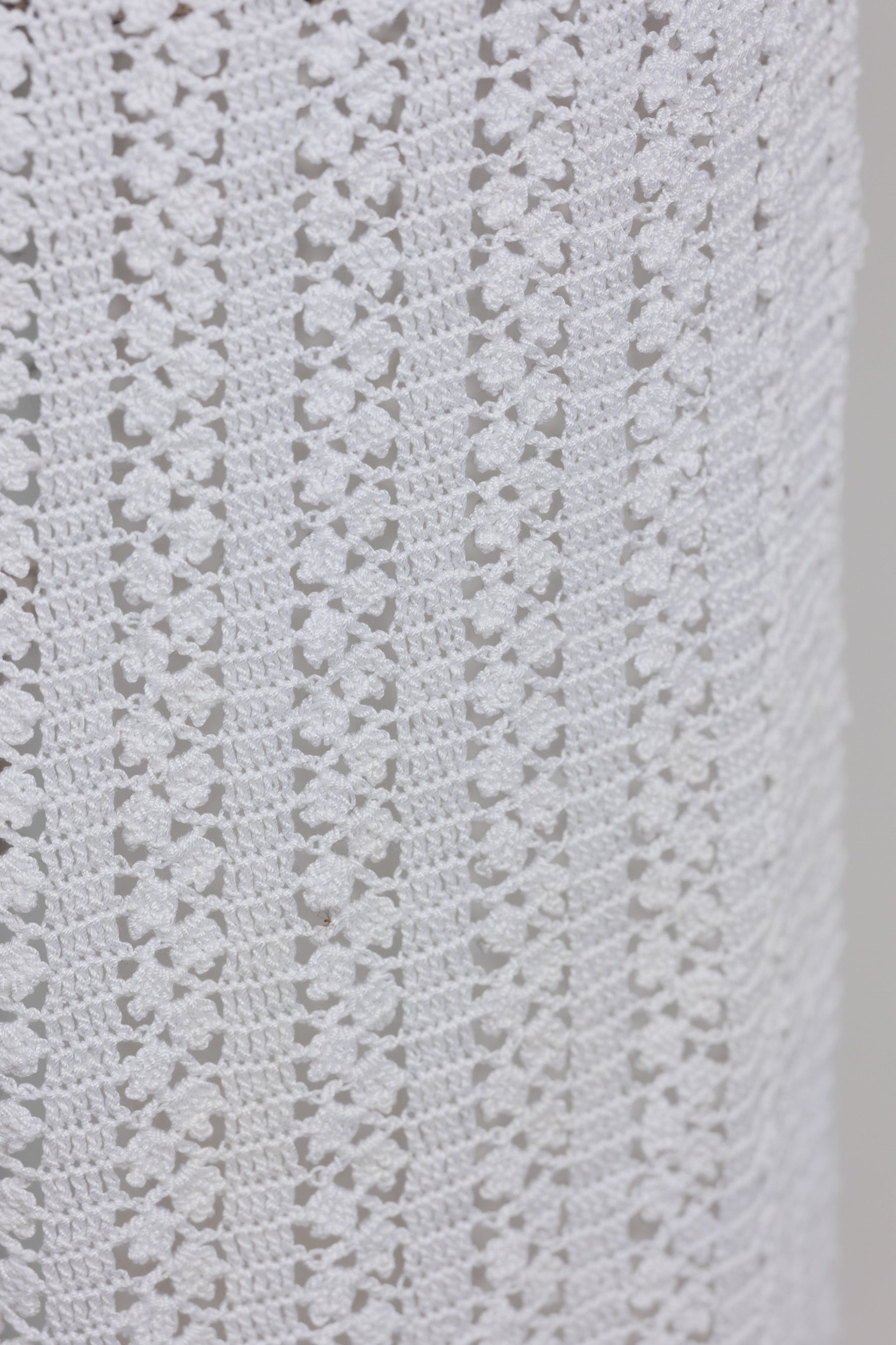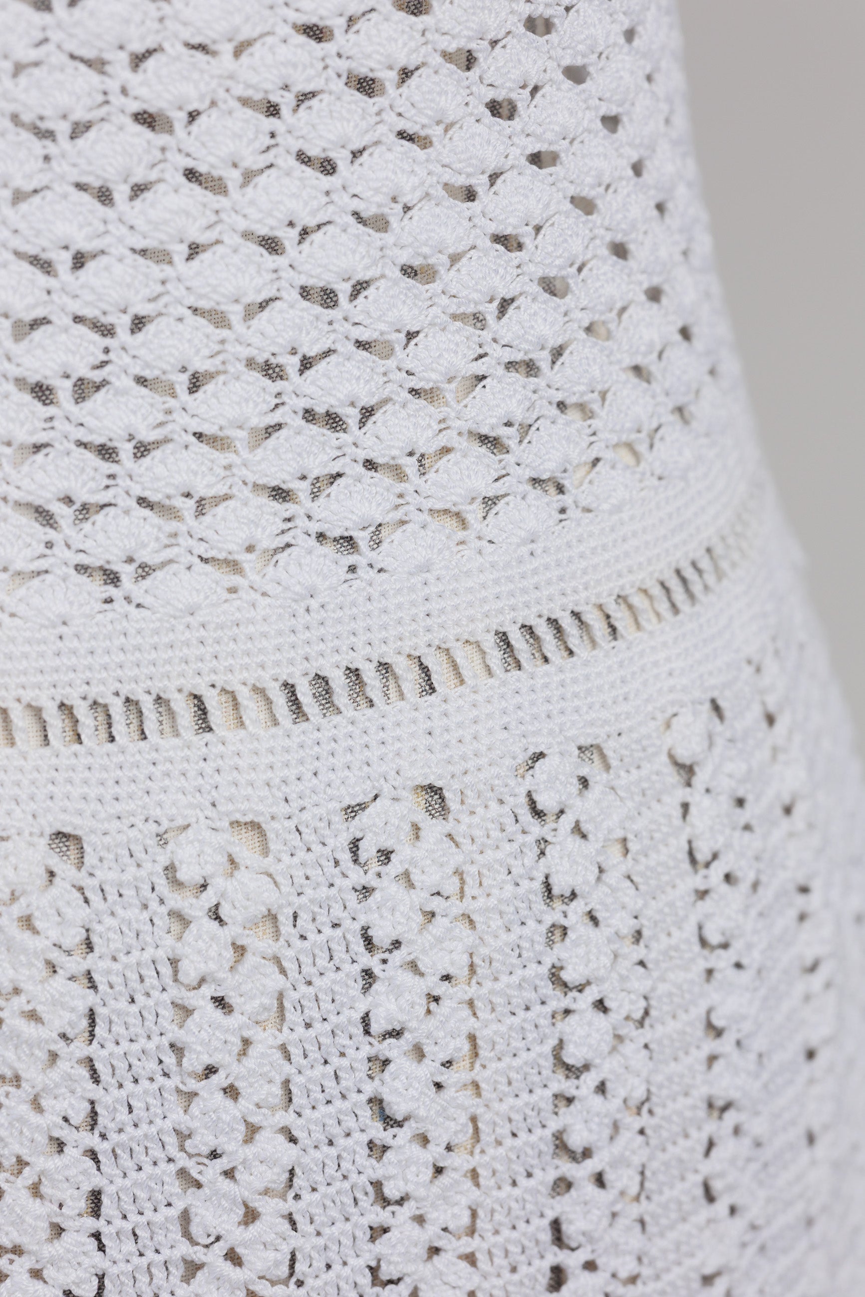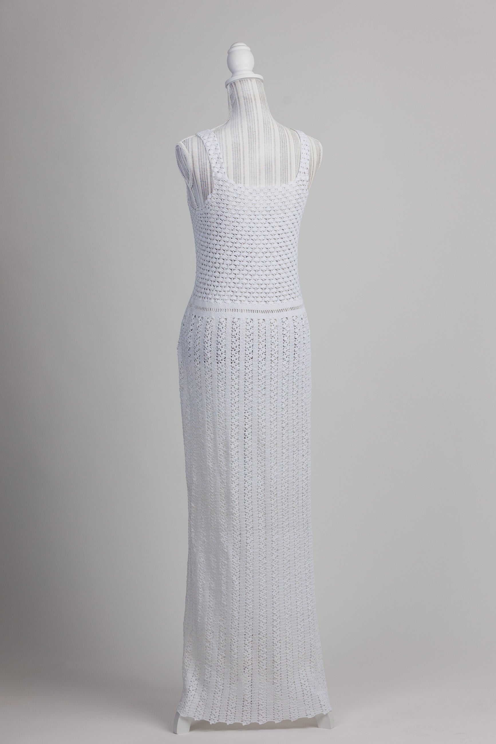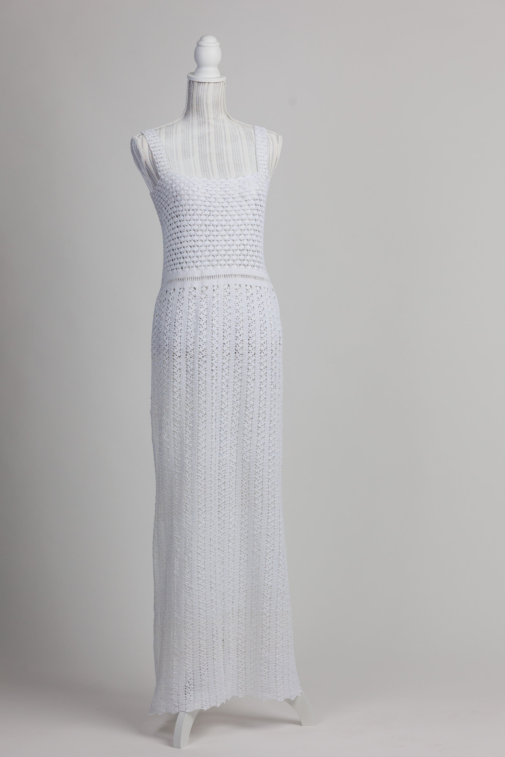 ELARA is a white crochet maxi dress with a square neckline and a clean, fitted shape. Made from a lightweight open-knit, it sits close through the bodice and falls straight to the ankle. Easy, breathable, and designed for warm days, long evenings, and everything in between.
